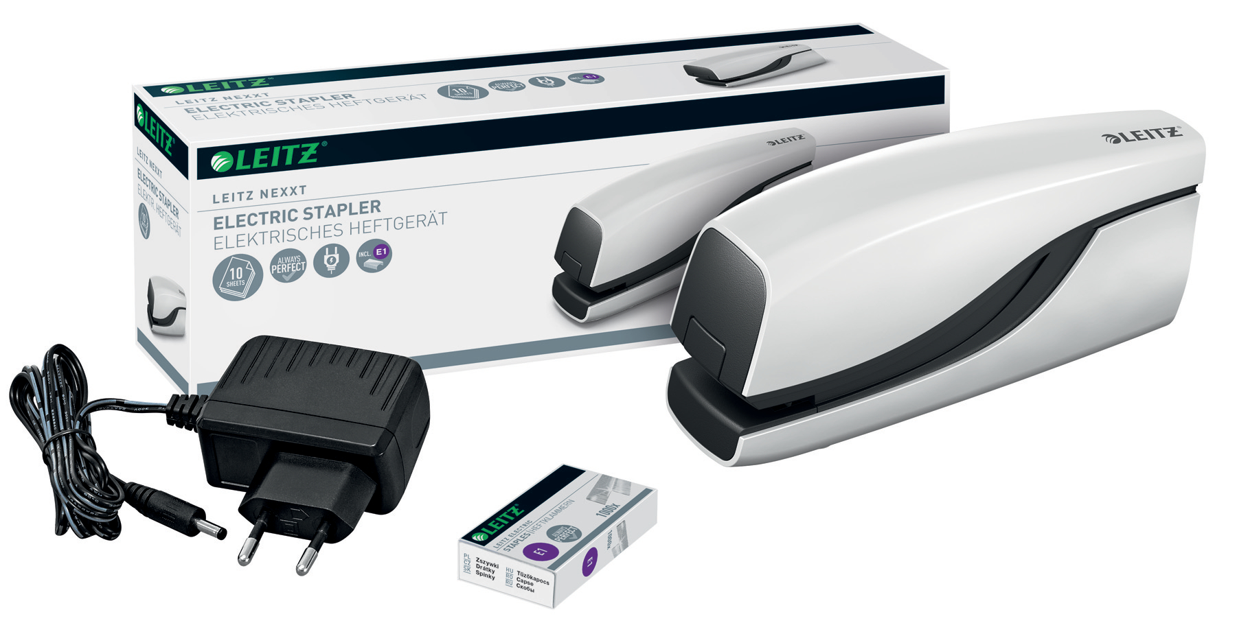 Capsator electric ce beneficiaza de designul si tehnologia inovatoare Leitz Nexxt Series. Capsare automata, fara efort. Performanta fiabila. Prevazut cu adaptor pentru priza si 1000 capse e1 incluse. Capacitate de capsare: 10 coli (80 g/mp). Capse utilizate: Leitz E1.