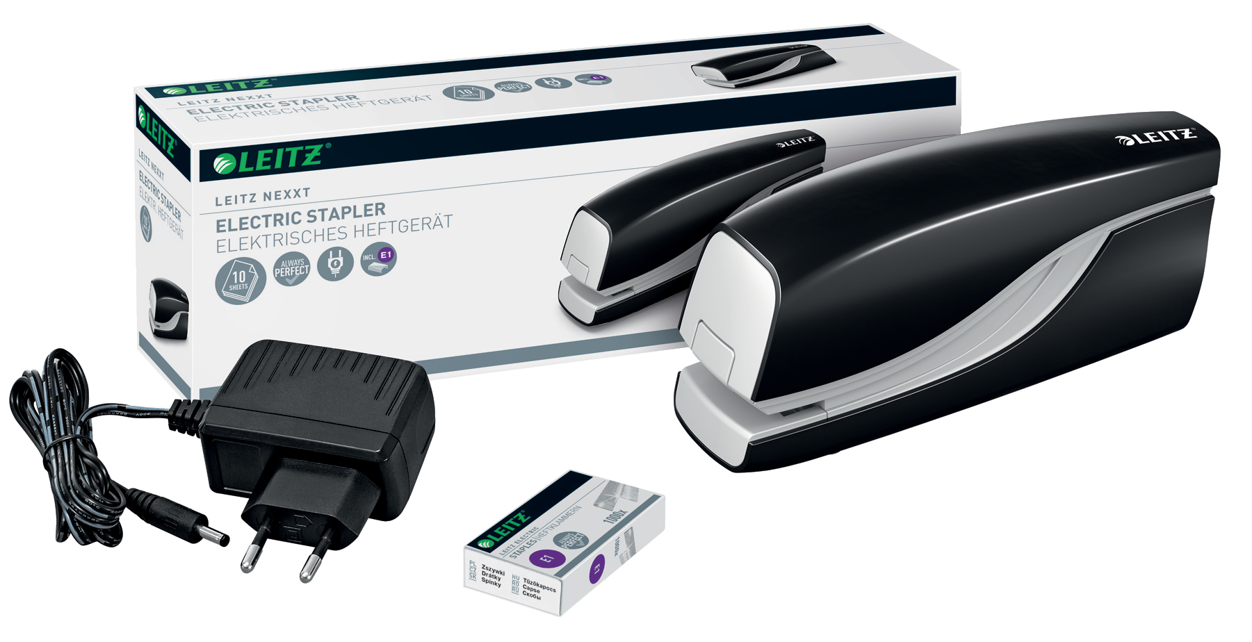 Capsator electric ce beneficiaza de designul si tehnologia inovatoare Leitz Nexxt Series. Capsare automata, fara efort. Performanta fiabila. Prevazut cu adaptor pentru priza si 1000 capse e1 incluse. Capacitate de capsare: 10 coli (80 g/mp). Capse utilizate: Leitz E1.