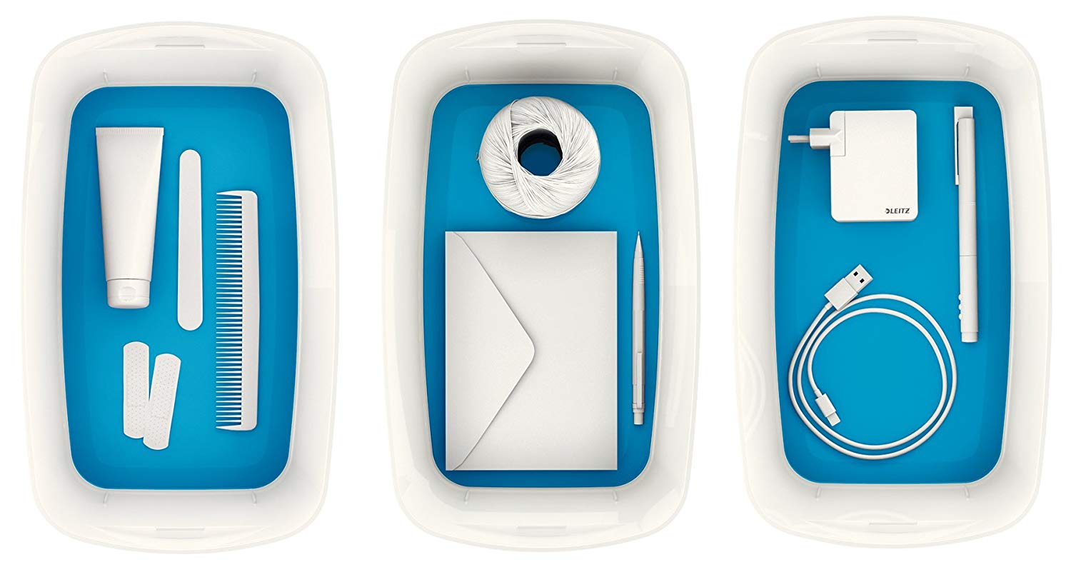 Cutie in culori duale stilate, pentru o organizare rapida si inteligenta. Combinata cu tavita de depozitare mica, sau cu tavita organizatoare cu maner mica, acest sistem permite solutii optime de gestionare a continutului. Fabricat dintr-un material ferm ABS, rezistent la zgarieturi si impermeabil, cu un aspect premium. Fara BPA (Bisfenol A). Economisirea spatiului: Cutia Leitz MyBox mare poate sustine deasupra ei, in sistem modular, 2 cutii MyBox pe un raft standard. Functie discreta de blocarea a capacului, in timp ce indepartarea capacului este la fel de usoara. Cand nu sunt folosite, tavitele pot fi depozitate una intr-alta pentru a salva spatiu. Usor de curatat, colturi moi rotunjite. Dimensiune: 318 x 128 x 191mm. Acest produs este comercializat de NVP Birotica, si poate fi comandat oriunde in Romania, cu taxa curier 20 lei (pentru plata cu cardul, sau 29 lei plata ramburs), cu transport gratuit pentru comenzi peste 150 lei.
