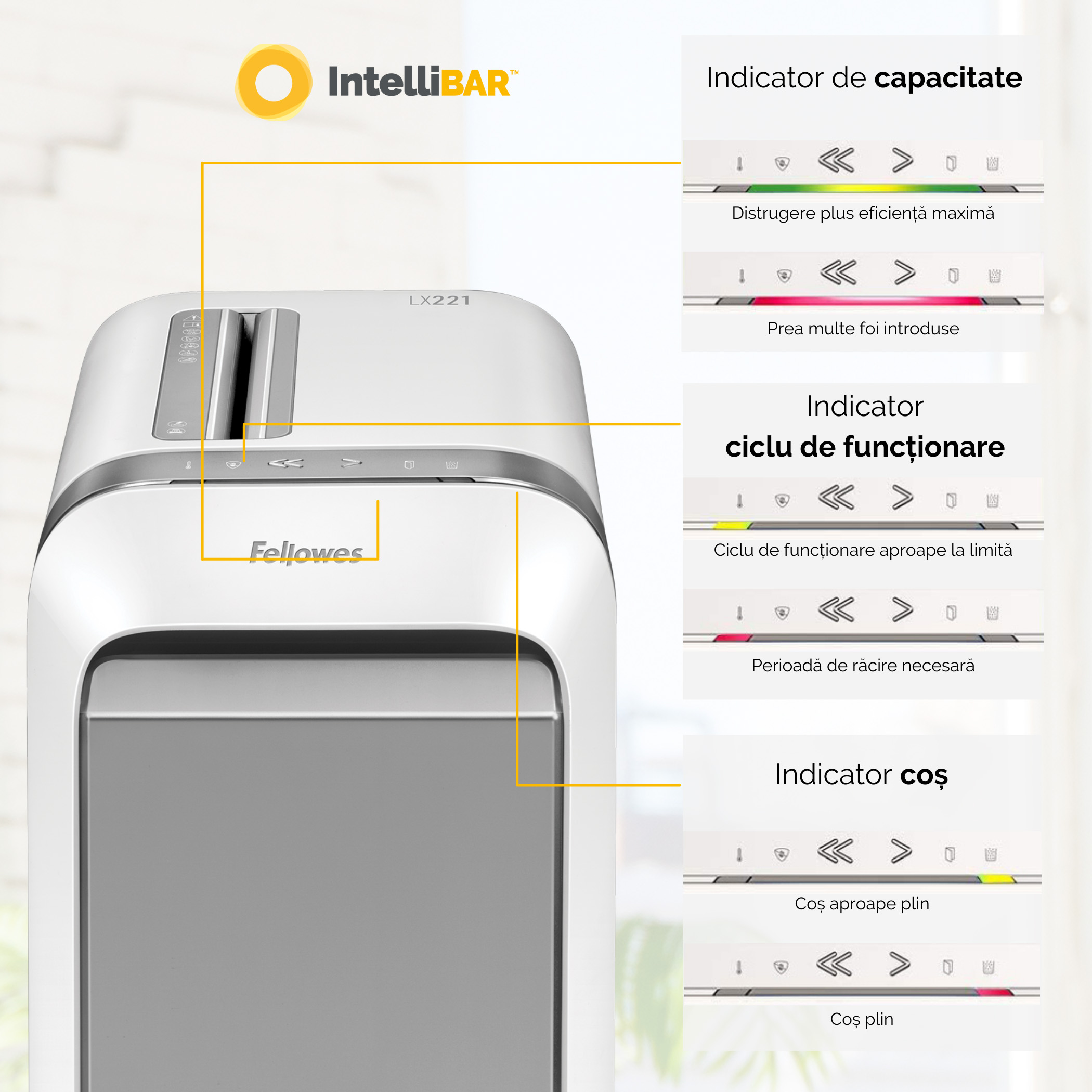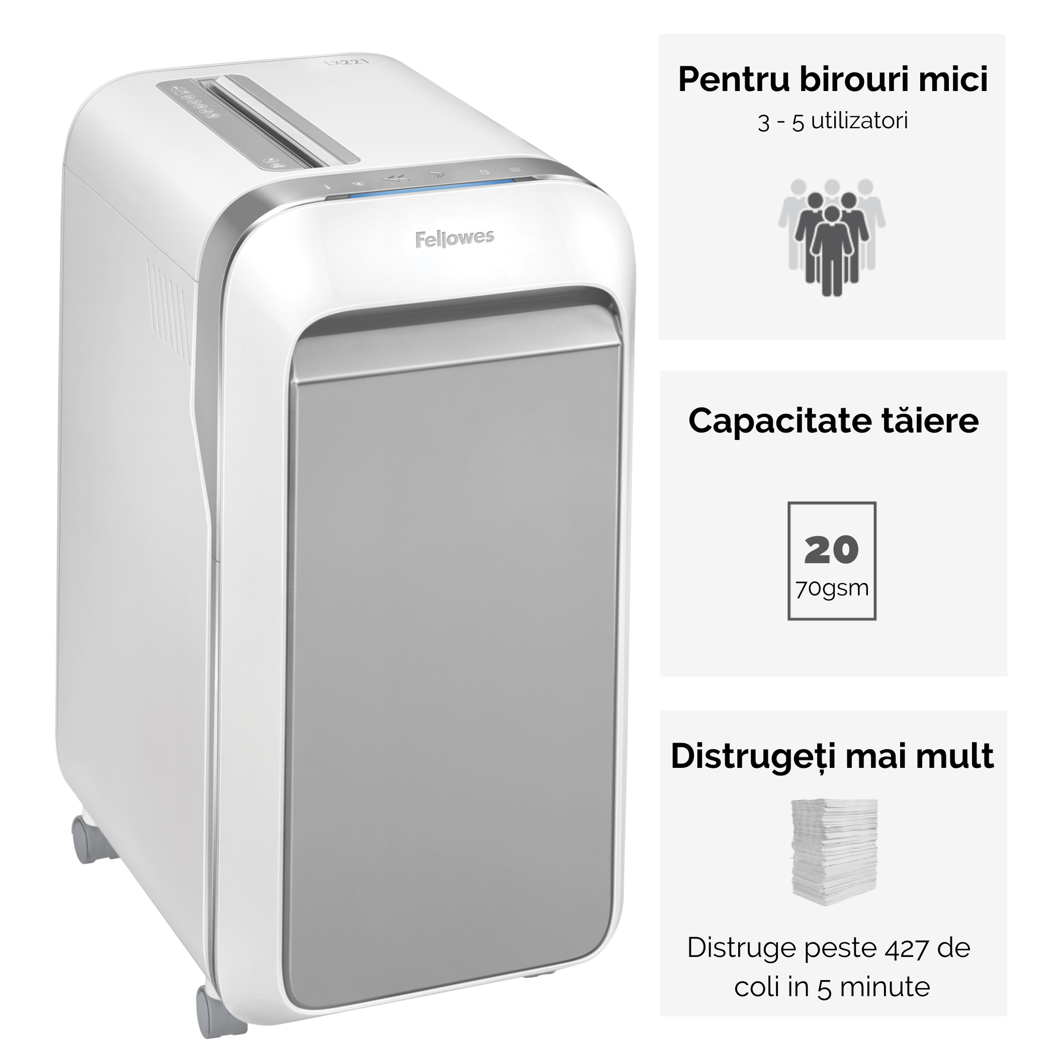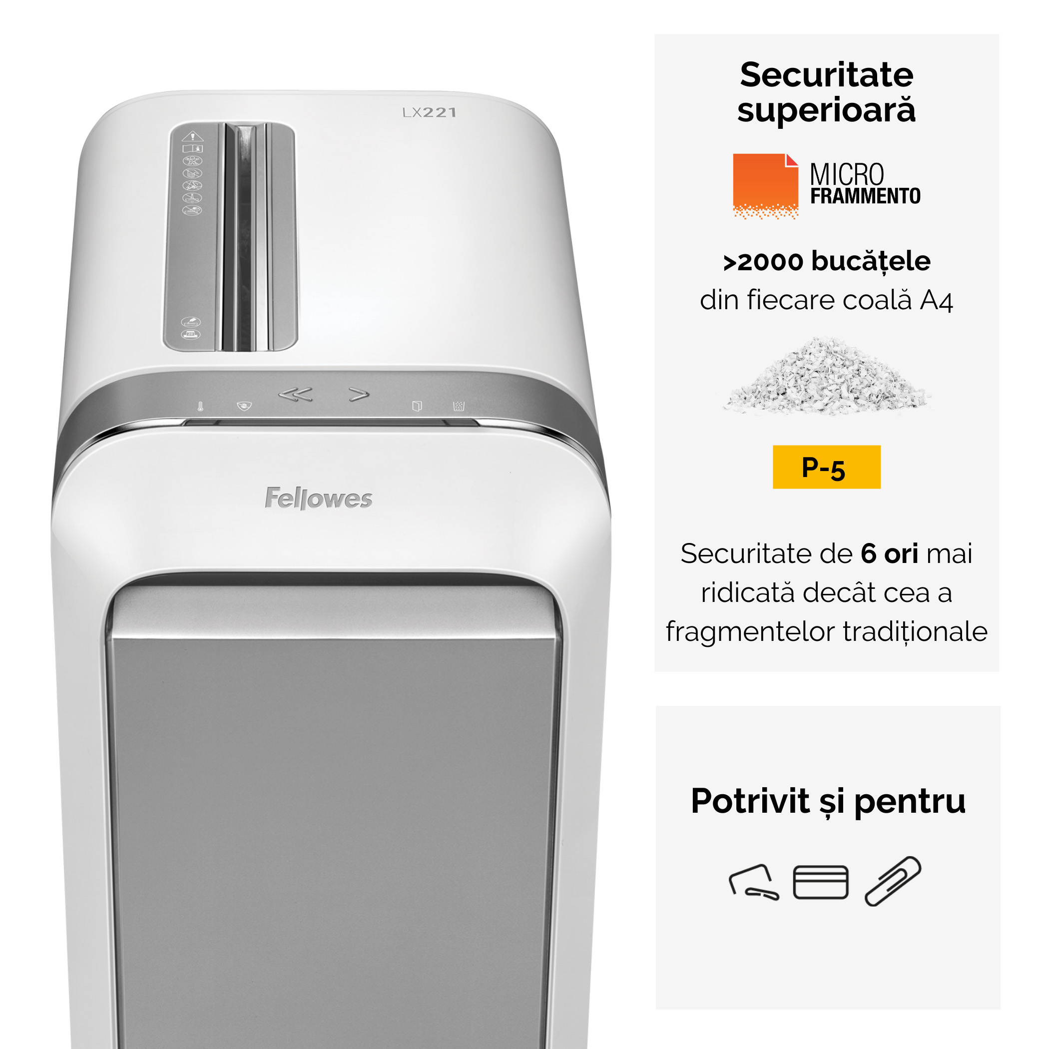 Distrugator Powershred LX221 Nivel maxim de securitate cu taiere in micro-fragmente, marunteste fiecare coala A4 in peste 2000 de bucatele (2x12mm P-5). Fiecare model include functiile inovatoare Fellowes pentru a va oferi o distrugere eficienta si sigura a documentelor, cu functionare 100% Jam Proof si operare silentioasa pentru a minimiza zgomotul din birou. Ideal pentru 3-5 utilizatori. Caracteristici Tip de taiere: particule micro-cut Dimensiune particule: 2 x 12 mm Latimea fantei: 230 mm Capacitate/coli: 20 coli Volum cos: 30 l Ciclu de lucru: 25 min on / 15 min off Greutate: 16.7 kg Dimensiune (xlxL): 590 x 419 x 299 mm Caracteristici care vor face utilizarea mai simpla: 100% Jam Proof System: Oprirea masinii in mod automat in cazul in care sunt prea multe coli introduse si functia inversa pentru a facilita eliberarea lamelor in timpul distrugerii. SafeSense: Senzor care opreste in mod automat distrugerea atunci cand mainile sunt in contact cu zona de intrare. Sleep Mode: Inchide distrugatorul dupa 2 minute de inactivitate.