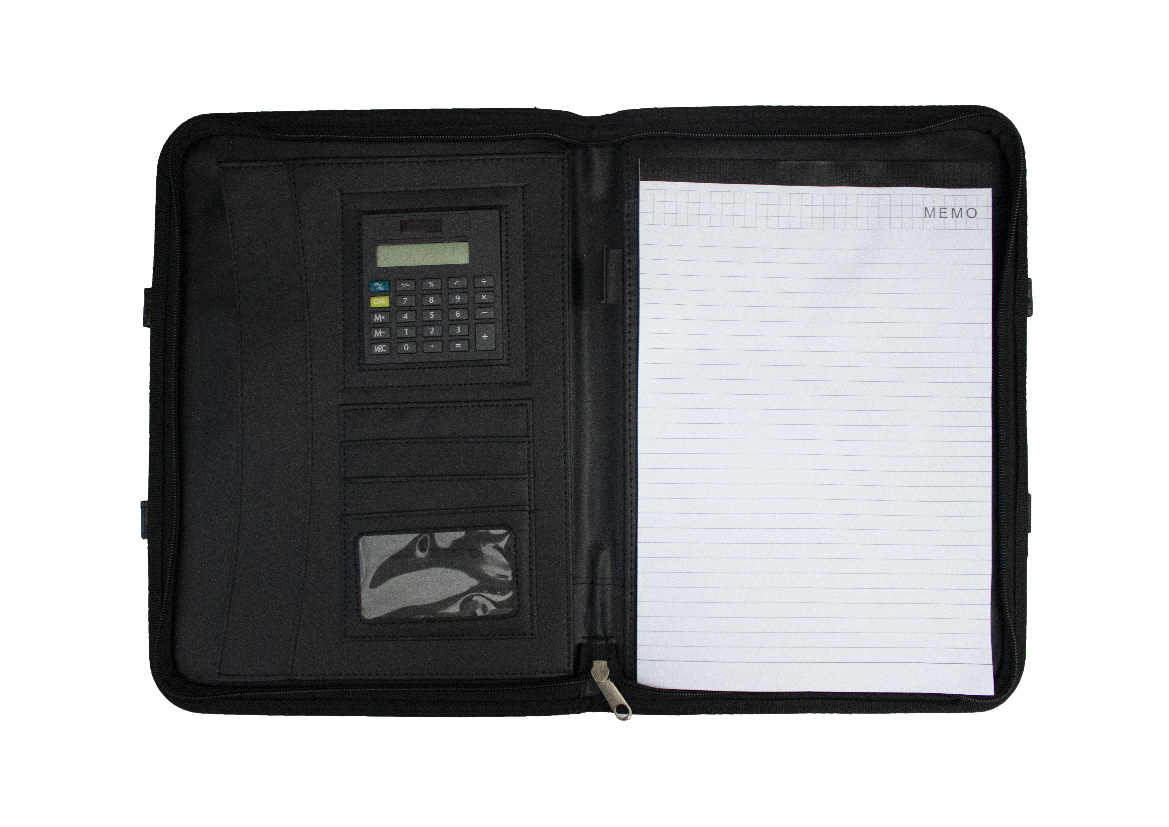 Confectionata din material imitatie piele Prevazuta cu clapa pentru inchidere Contine: compartimente multiple, blocnotes, calculatorInchidere cu fermoar Culoare: negru Dimensiune: 335*260*25 mm