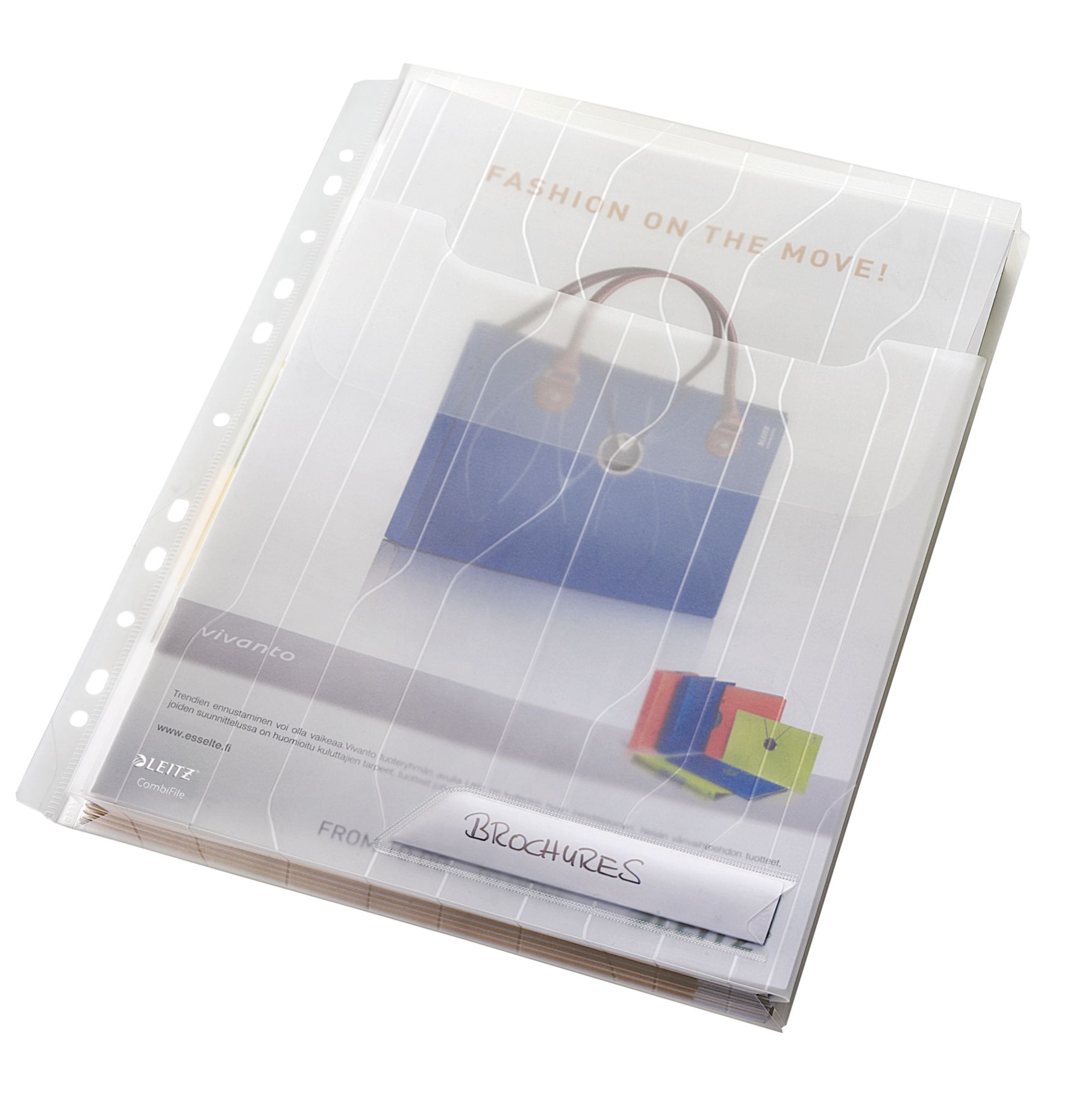 Mapa si folie de protectie flexibila, cu sistem unic de pliere a marginii perforate. Burduf de 20 mm. Buzunar cu eticheta. Inchidere: cu clapa. Polipropilena (PP) gravata in relief. Grosime: 200 microni. Capacitate: 150 coli. Format A4. Ambalare: 3 buc/set. Acest produs este comercializat de NVP Birotica, si poate fi comandat oriunde in Romania, cu taxa curier 20 lei (pentru plata cu cardul, sau 29 lei plata ramburs), cu transport gratuit pentru comenzi peste 150 lei.