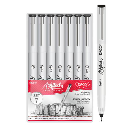 Pix liner grafic Arhitect set 7 Daco ? liner pentru desen si arhitectura ? varf cu protectie metalica: 0,05, 0,1, 0,3, 0,5, 0,7, 1 mm si tip pensula ? cerneala pe baza de pigmenti, rezistenta la apa