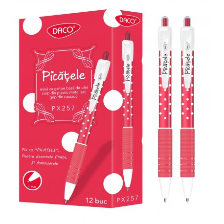 Pix Daco Picatele  grosime varf: 1 mm  mina gel pe baza de ulei  corp din plastic  culori mina: albastru, rosu Acest produs este comercializat de NVP Birotica, si poate fi comandat oriunde in Romania, cu taxa curier 20 lei (pentru plata cu cardul, sau 29 lei plata ramburs), cu transport gratuit pentru comenzi peste 150 lei.