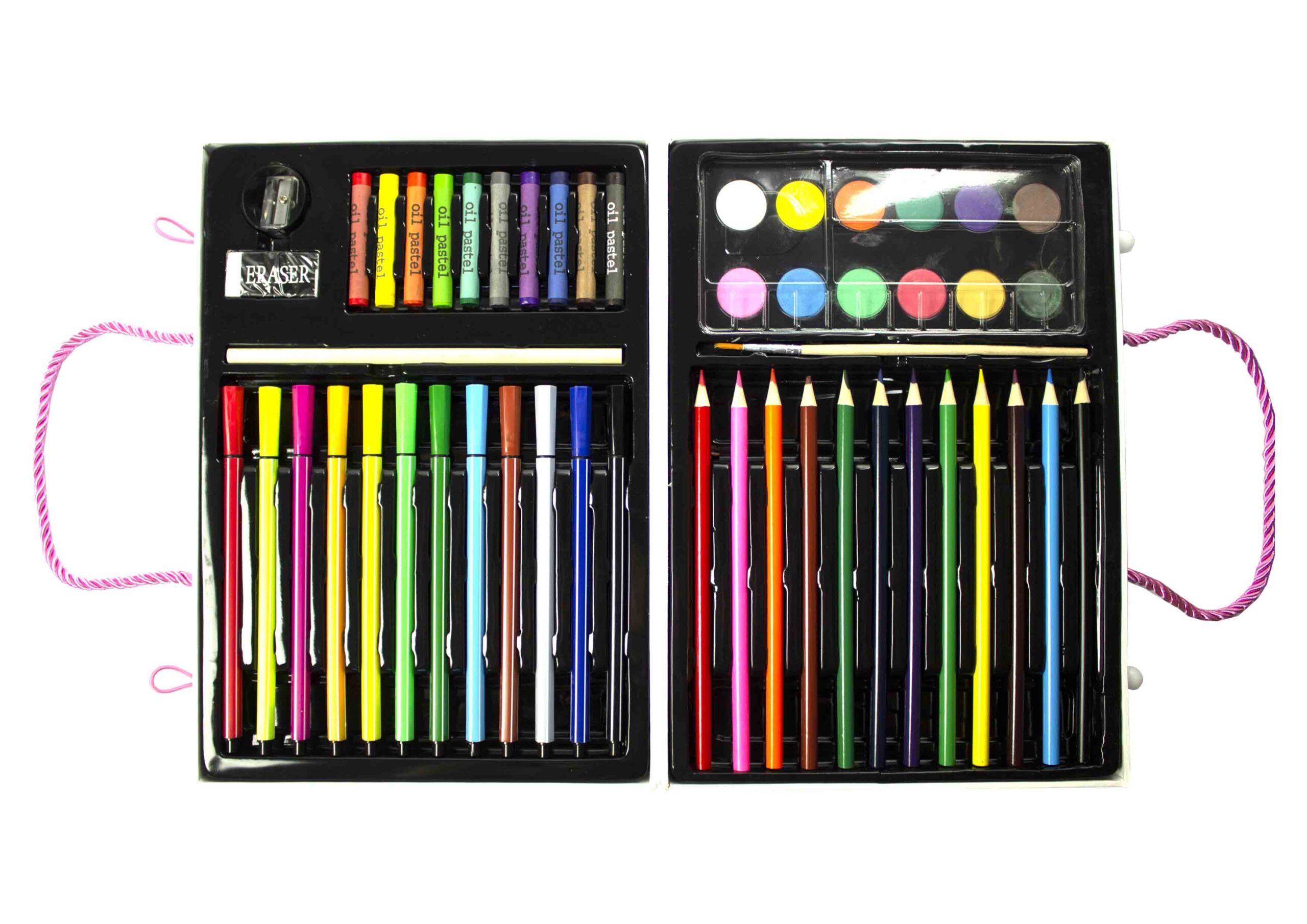Set pictura si desen, 68 piese, No. A1916 Contine: 12 carioci color, 12 creioane colorate, 12 acuarele (pe baza de apa), 12 coli cu stickere color, 10 creioane cerate color, 5 coli cartonate, 1 ascutitoare, 1 creion HB, 1 pensula, 1 radiera, 1 paleta plastic