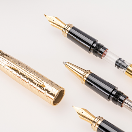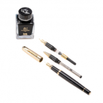 Set stilou caligrafic + roller + calimara 888 Picasso  stilou metalic pentru caligrafie, ornamente aurii   stilou cu convertor si penita tip F pentru scriere caligrafica, o rezerva de penita pentru scriere fina, o rezerva cu cap tip roller  calimara albastra Acest produs este comercializat de NVP Birotica, si poate fi comandat oriunde in Romania, cu taxa curier 20 lei (pentru plata cu cardul, sau 29 lei plata ramburs), cu transport gratuit pentru comenzi peste 150 lei.