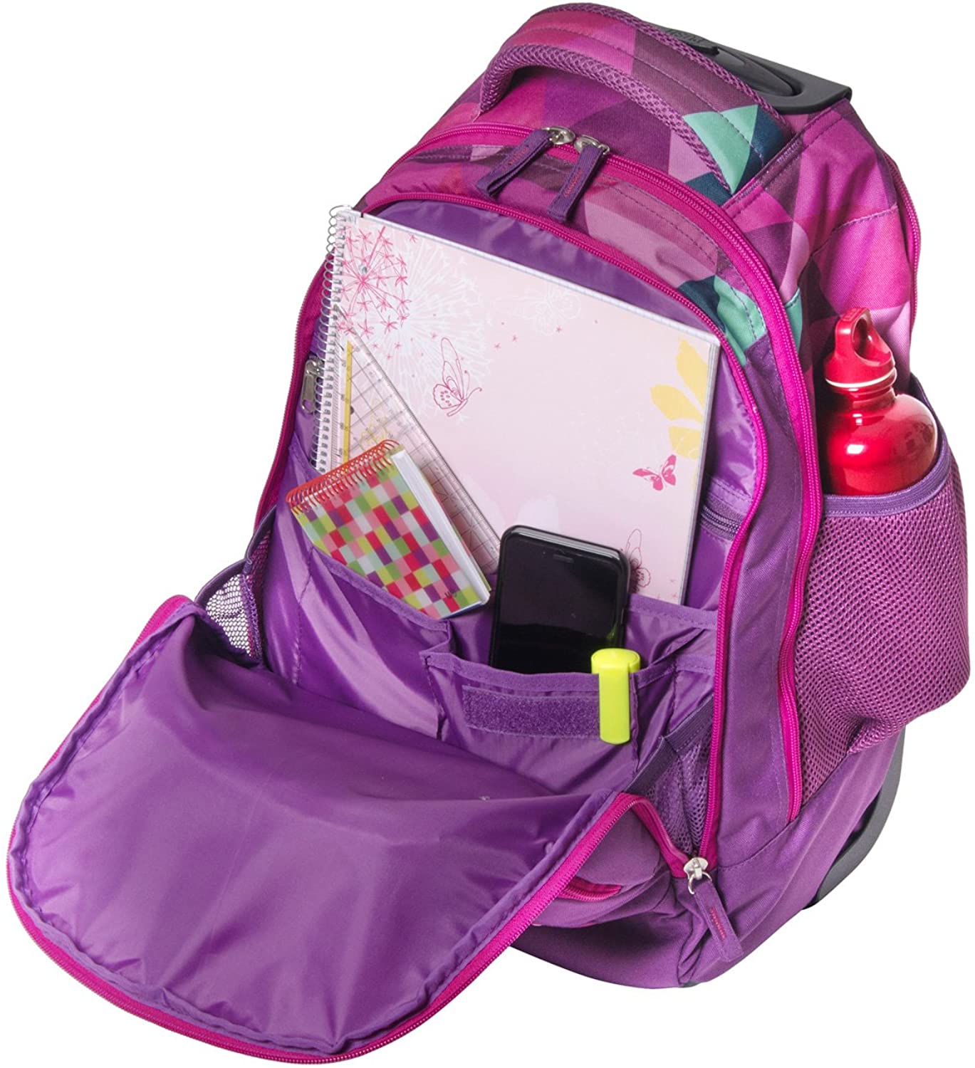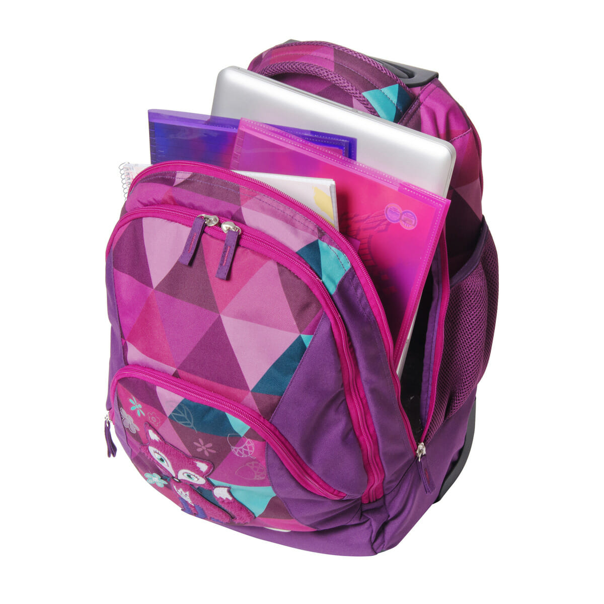 Rucsac 2 in 1, tip troller. Compartiment principal, compartiment mijloc cu organizator, buzunar frontal si buzunare laterale cu plasa. Compatibil cu laptop, dimensiunea maxima a laptopului de 15,6 inch. Maner telescopic si roti cu rulare lina. Material hidrofug si elemente reflectorizante. Motiv: Frieda Vulpea, volum: 31 litri. Dimensiune 32 x 21 x 46 cm. 1.78 kg.